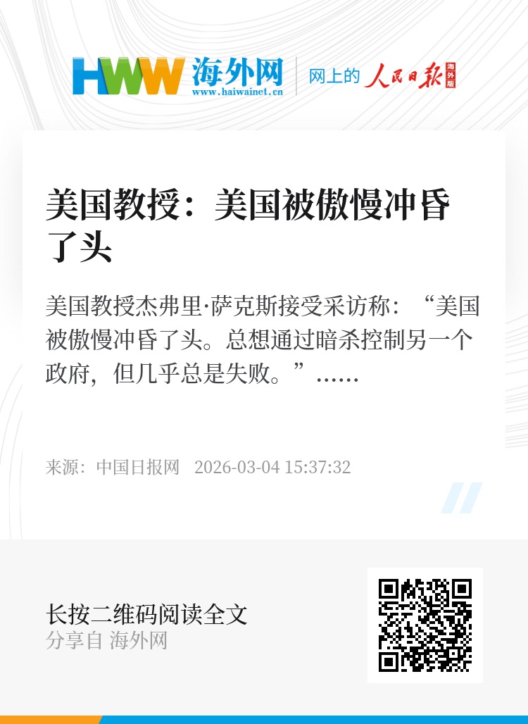 美国教授杰弗里·萨克斯接受采访称:“美国被傲慢冲昏了头。总想通过暗杀控制另一个政府,但几乎总是失败。”