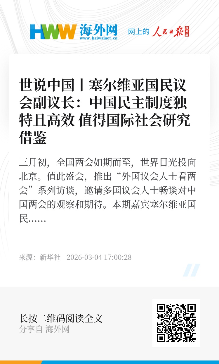 本期嘉宾塞尔维亚国民议会副议长拉古什在接受采访时表示,两会是理解当今中国的一个重要窗口,塞尔维亚期待倾听中国即将发出的声音。她说,中国式民主以人民为核心,始终围绕广大民众的需求。几十年来,中国用实际行动向世人证明这一政治制度行之有效,是一个可供国际社会借鉴的典范。