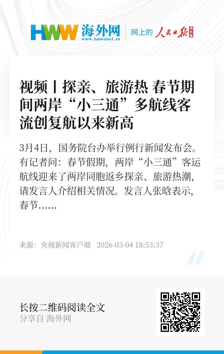3月4日,国务院台办举行例行新闻发布会。有记者问:春节假期,两岸“小三通”客运航线迎来了两岸同胞返乡探亲、旅游热潮,请发言人介绍相关情况。