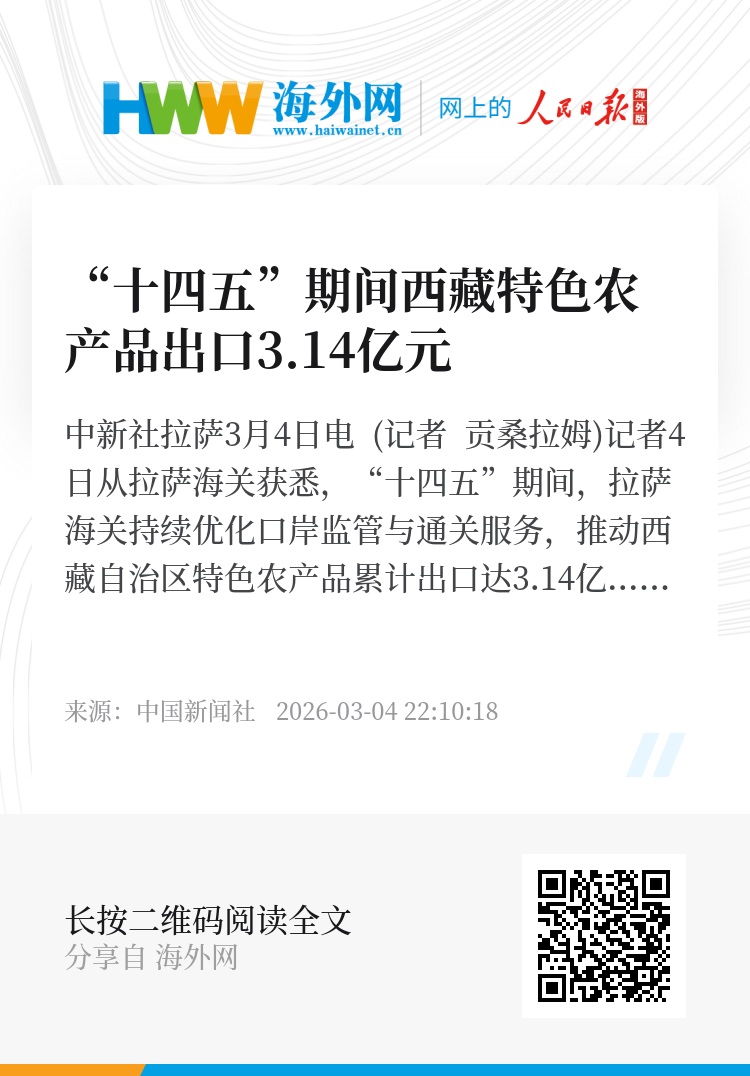 中新社拉萨3月4日电 (记者 贡桑拉姆)记者4日从拉萨海关获悉,“十四五”期间,拉萨海关持续优化口岸监管与通关服务,推动西藏自治区特色农产品累计出口达3.14亿元人民币,在筑牢高原生态屏障的同时,助力特色产品“走出去”、境外优质资源“引进来”,实现生态保护与对外开放协同增效。