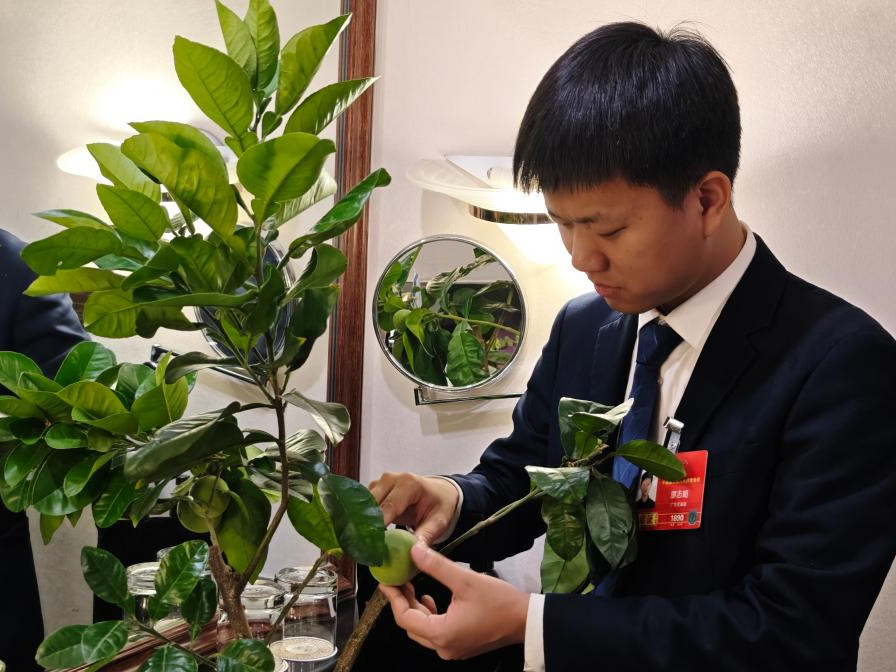 全国人大代表、广东茂名化州市培林橘红种植专业合作社社长廖志略带来的化橘红树苗。新华社记者 唐诗凝 摄