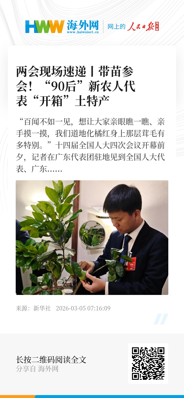 十四届全国人大四次会议开幕前夕,记者在广东代表团驻地见到全国人大代表、广东茂名化州市培林橘红种植专业合作社社长廖志略时,他正忙着“开箱”今年带到北京参会的手信——一株挂了果的化橘红树苗,还有一兜深加工的化橘红产品和一张集纳了乡亲们笑脸的3D照片。