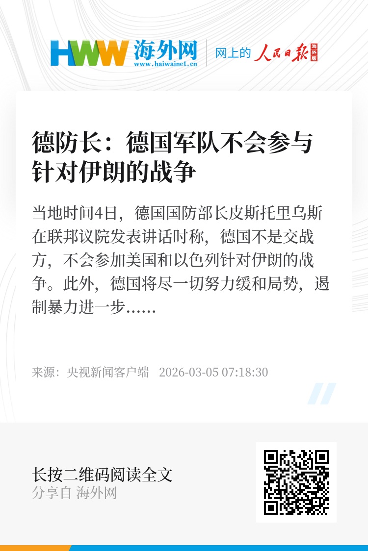 当地时间4日,德国国防部长皮斯托里乌斯在联邦议院发表讲话时称,德国不是交战方,不会参加美国和以色列针对伊朗的战争。此外,德国将尽一切努力缓和局势,遏制暴力进一步蔓延。