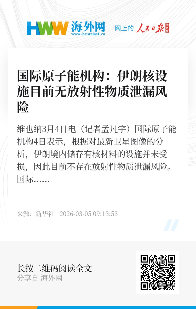 新华社维也纳3月4日电(记者孟凡宇)国际原子能机构4日表示,根据对最新卫星图像的分析,伊朗境内储存有核材料的设施并未受损,因此目前不存在放射性物质泄漏风险。
