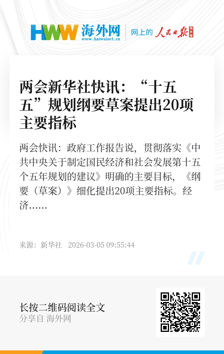 两会新华社快讯:政府工作报告说,贯彻落实《中共中央关于制定国民经济和社会发展第十五个五年规划的建议》明确的主要目标,《纲要(草案)》细化提出20项主要指标。经济发展方面,围绕增长、结构、效率提出3项指标。其中,提出国内生产总值增长保持在合理区间、各年度视情提出。创新驱动方面,围绕创新投入及其成效提出3项指标。其中,提出全社会研发经费投入年均增长7%以上。民生福祉方面,针对性提出就业、收入、教育、医疗、健康、“一老一小”等7项指标。绿色低碳方面,围绕降碳减污、生态环保等提出5项指标。其中,提出单位国内生产总值二氧化碳排放累计降低17%,继续推动重点领域绿色低碳转型。安全保障方面,围绕粮食、能源生产能力提出2项指标,着力夯实国家安全重要基础保障。