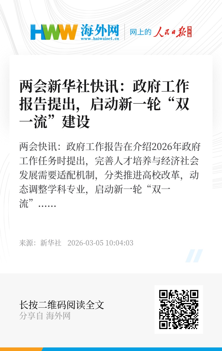 两会新华社快讯:政府工作报告在介绍2026年政府工作任务时提出,完善人才培养与经济社会发展需要适配机制,分类推进高校改革,动态调整学科专业,启动新一轮“双一流”建设,建设国家交叉学科中心,加大拔尖创新人才自主培养力度。