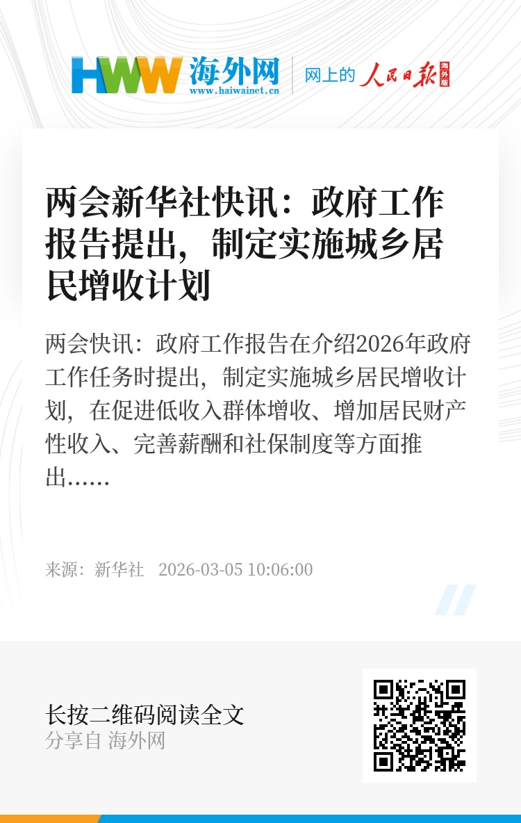 两会新华社快讯:政府工作报告在介绍2026年政府工作任务时提出,制定实施城乡居民增收计划,在促进低收入群体增收、增加居民财产性收入、完善薪酬和社保制度等方面推出一批务实举措。