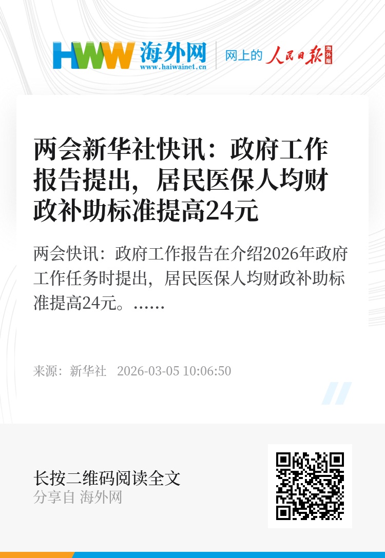 两会新华社快讯:政府工作报告在介绍2026年政府工作任务时提出,居民医保人均财政补助标准提高24元。