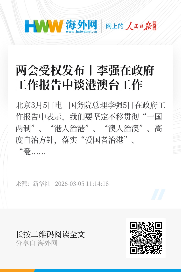 新华社北京3月5日电 国务院总理李强5日在政府工作报告中表示,我们要坚定不移贯彻“一国两制”、“港人治港”、“澳人治澳”、高度自治方针,落实“爱国者治港”、“爱国者治澳”原则,提升港澳依法治理效能,促进港澳经济社会发展。支持港澳更好融入和服务国家发展大局,发挥港澳背靠祖国、联通世界独特优势和重要作用,促进香港、澳门长期繁荣稳定。