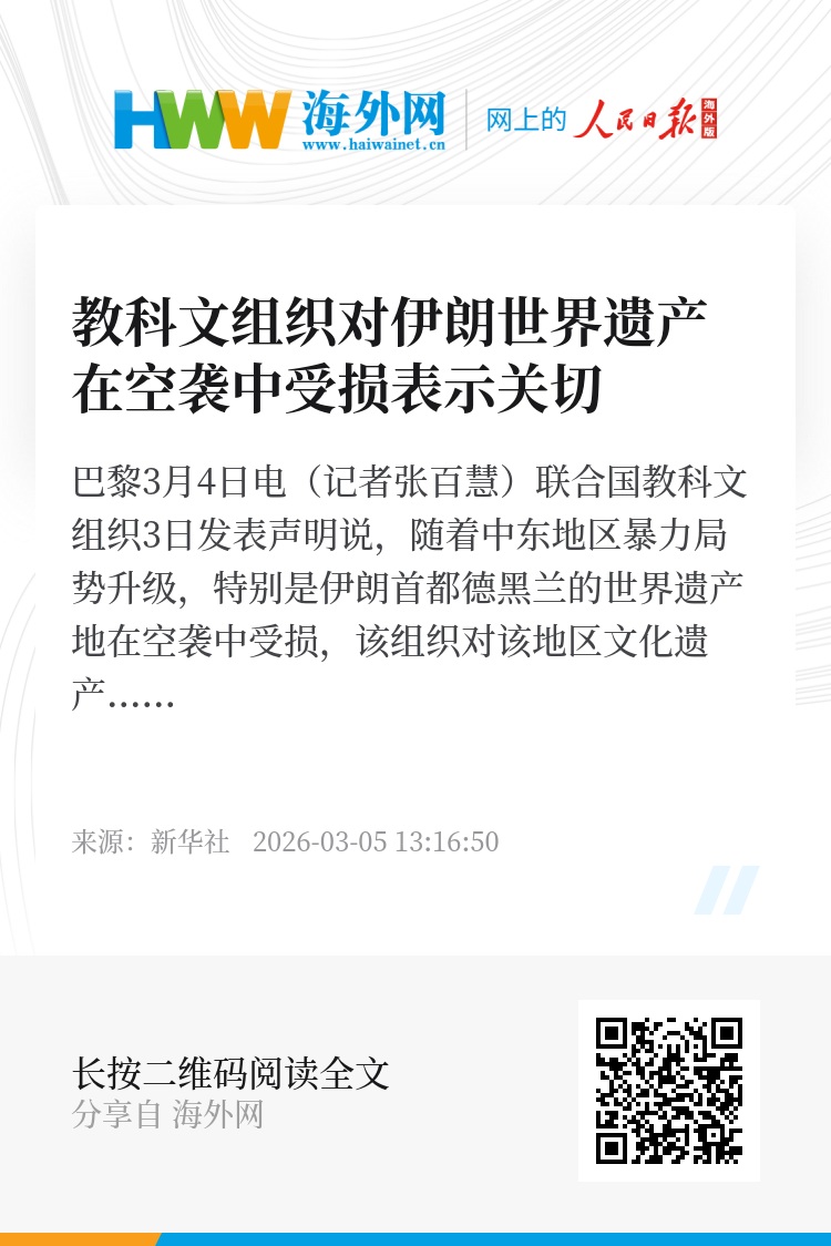 新华社巴黎3月4日电(记者张百慧)联合国教科文组织3日发表声明说,随着中东地区暴力局势升级,特别是伊朗首都德黑兰的世界遗产地在空袭中受损,该组织对该地区文化遗产地的保护状况表示关切。