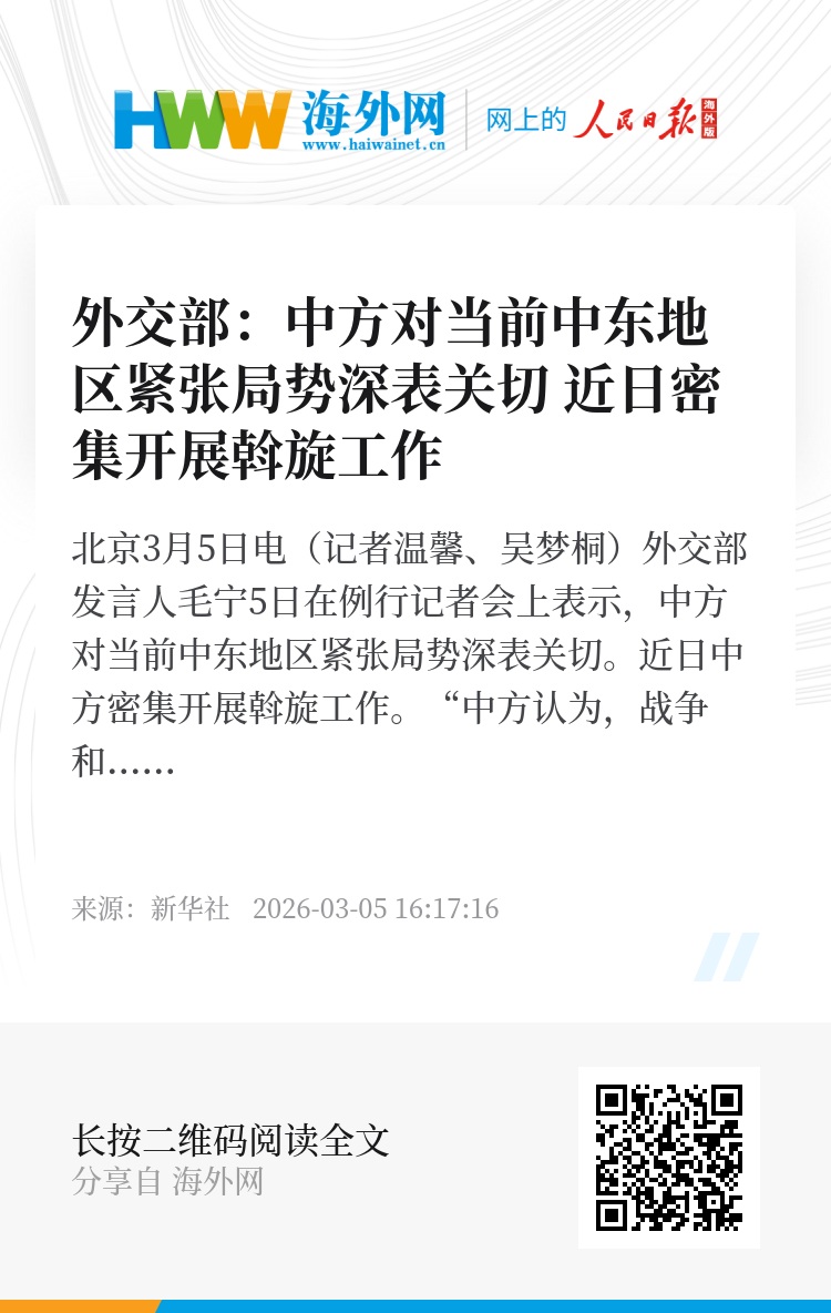 新华社北京3月5日电(记者温馨、吴梦桐)外交部发言人毛宁5日在例行记者会上表示,中方对当前中东地区紧张局势深表关切。近日中方密集开展斡旋工作。