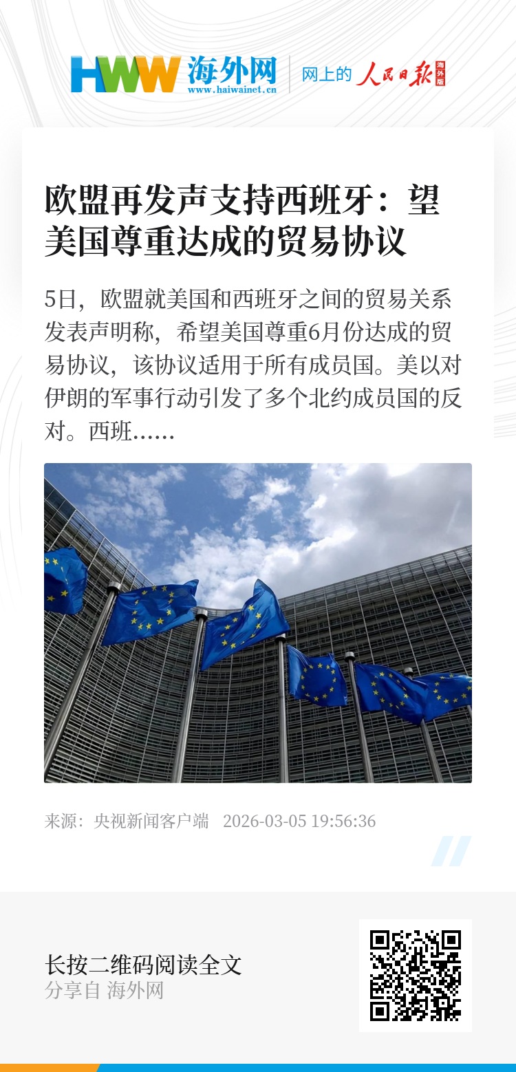 5日,欧盟就美国和西班牙之间的贸易关系发表声明称,希望美国尊重6月份达成的贸易协议,该协议适用于所有成员国。