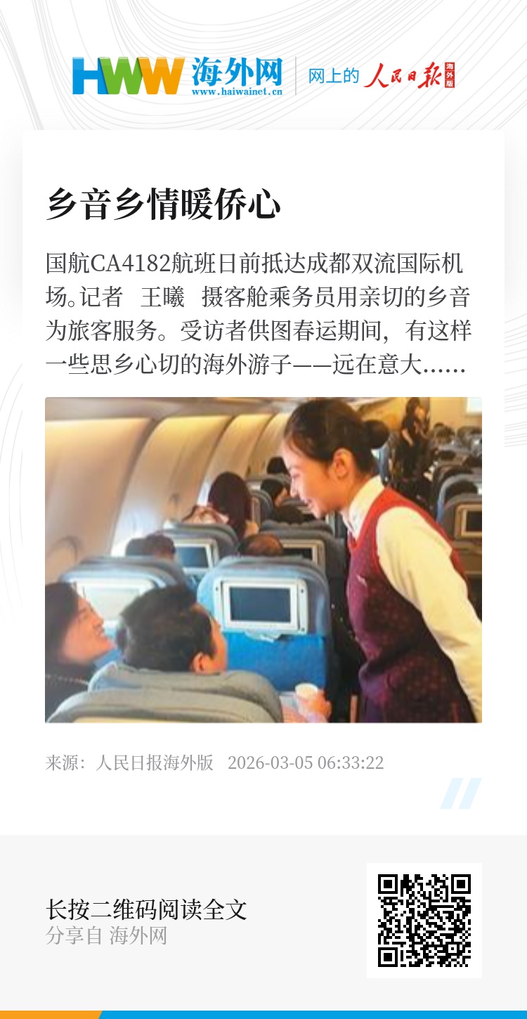 2026年春运中,国航米兰—温州航线作为连接海外侨胞与故乡的“空中纽带”,成为众多温州籍旅客返乡探亲的热门通道,呈现出“孩子多、老人多、行李多、方言交流多”等特点。面对多元化的出行需求,国航精心打造“侨乡亲情服务”,在乘务组中安排能够使用温州话的乘务员,护航这条独特的“亲情春运线”,努力做到“服务无障碍,乡情零距离”。
