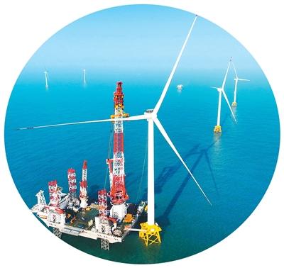 位于福建闽南海域的“大桥海风”号2000吨自升式海上风电安装平台和20兆瓦风电机组吊装现场。新华社记者 林善传 摄