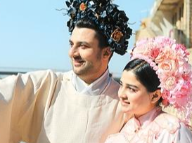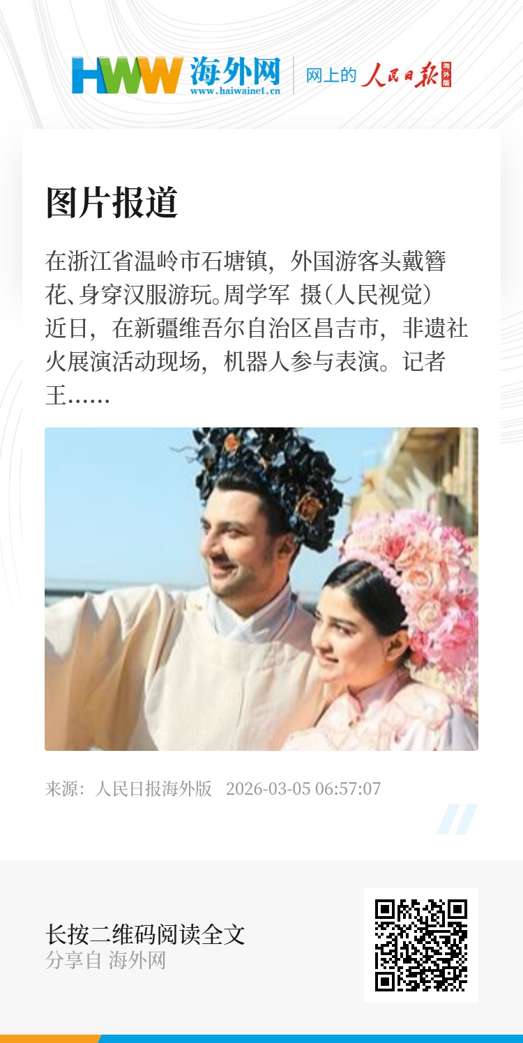 在浙江省温岭市石塘镇,外国游客头戴簪花、身穿汉服游玩。周学军 摄(人民视觉)
