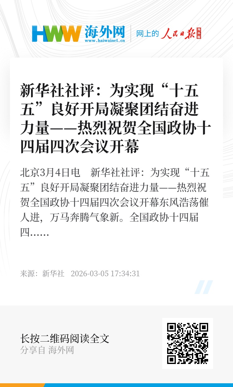 新华社北京3月4日电 新华社社评:为实现“十五五”良好开局凝聚团结奋进力量——热烈祝贺全国政协十四届四次会议开幕