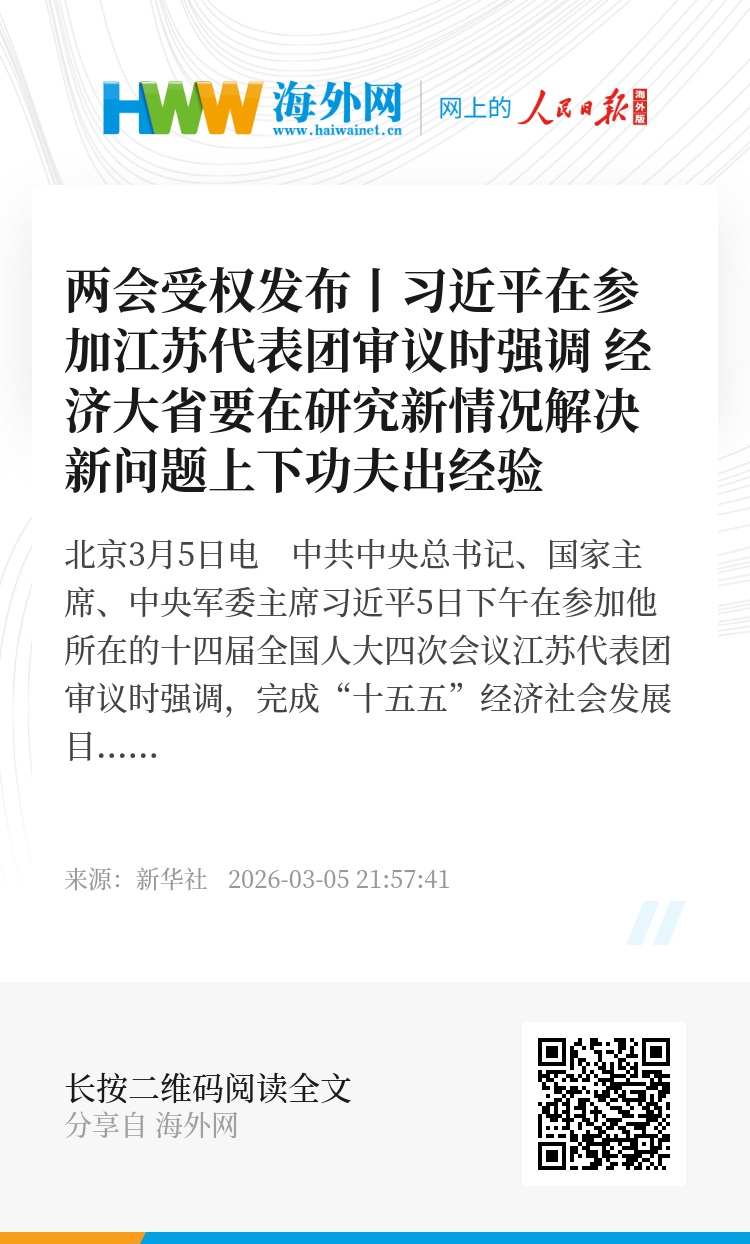 新华社北京3月5日电 中共中央总书记、国家主席、中央军委主席习近平5日下午在参加他所在的十四届全国人大四次会议江苏代表团审议时强调,完成“十五五”经济社会发展目标任务,需要应对更加复杂的环境、解决更多深层次矛盾。江苏等经济大省处在改革开放前沿,要在研究新情况、解决新问题上下功夫、出经验。