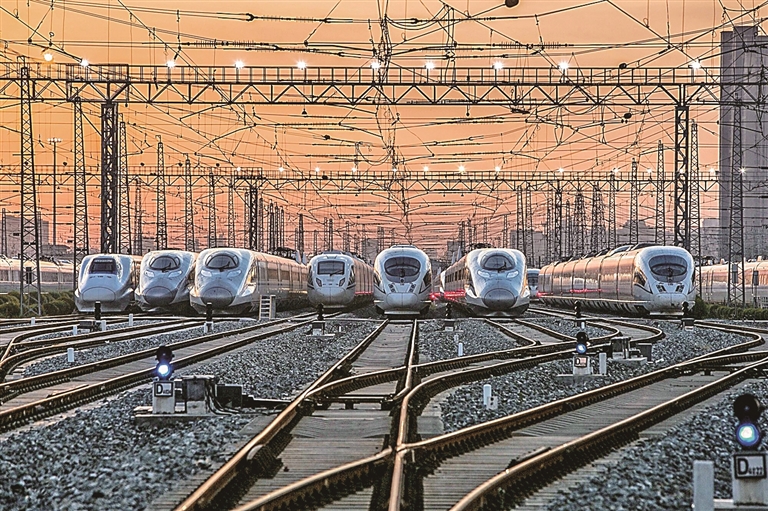 2月1日,国铁西安局西安动车段动车库内高铁动车组整齐列阵。新华社发