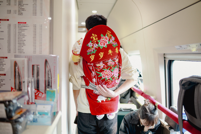 车厢内,邻座的大叔分享着驴肉火烧,附近的阿姨品尝着碗团……各地的年货汇成动人的人间烟火。