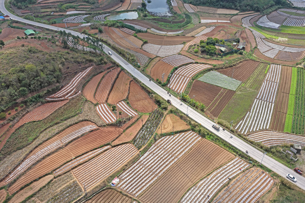 3月1日,广西南宁市邕宁区蒲庙镇村民忙着春耕春管,田园里一派繁忙景象(无人机照片)。新华社记者 周华 摄