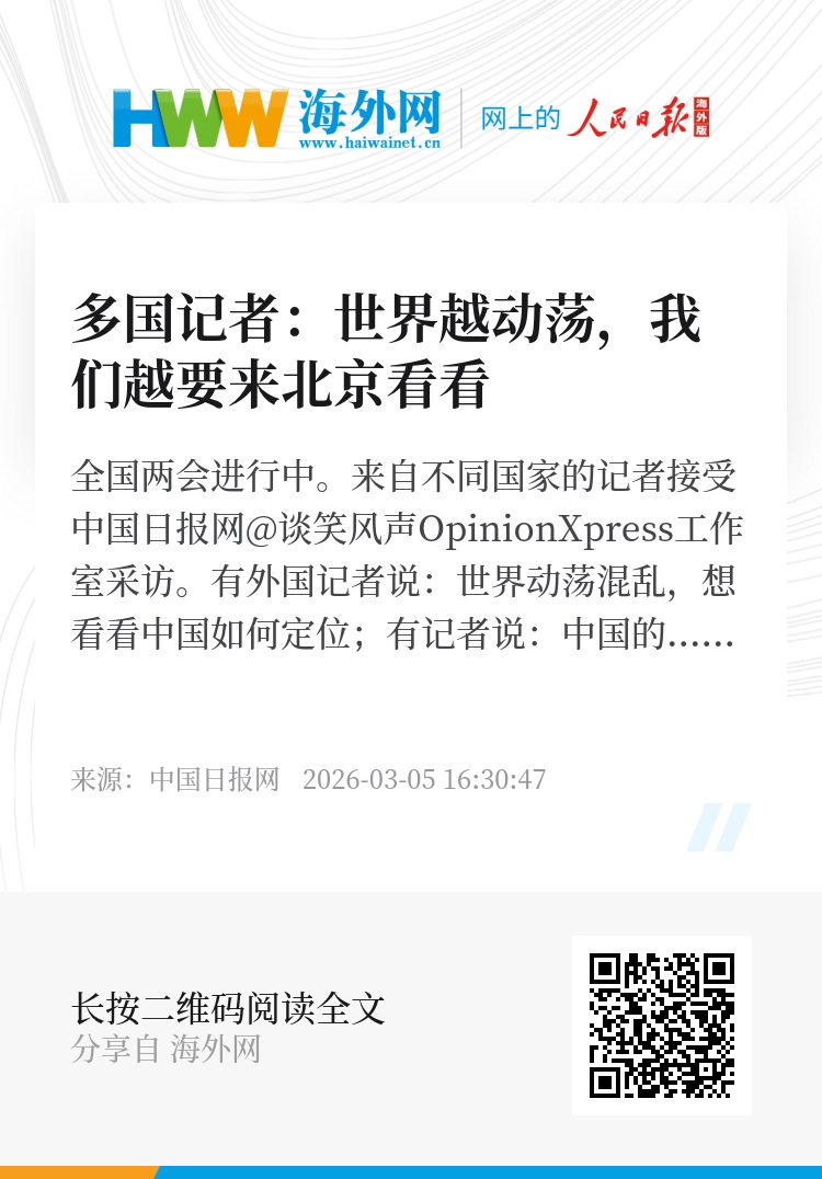 全国两会进行中。来自不同国家的记者接受中国日报网@谈笑风声OpinionXpress工作室采访。有外国记者说:世界动荡混乱,想看看中国如何定位;有记者说:中国的进步始终以人民为中心。他们来报道全国两会,也来寻求答案。而中国两会,正在给出答案。(记者:赵满丰)