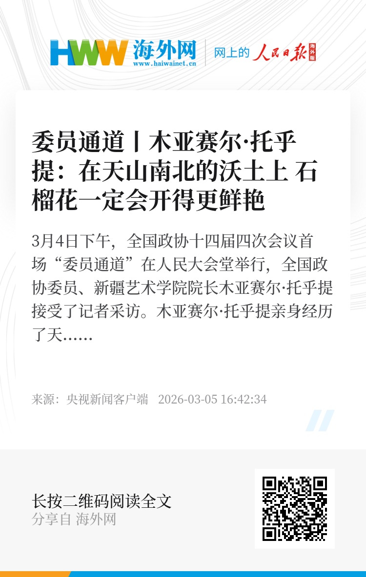 3月4日下午,全国政协十四届四次会议首场“委员通道”在人民大会堂举行,全国政协委员、新疆艺术学院院长木亚赛尔·托乎提接受了记者采访。