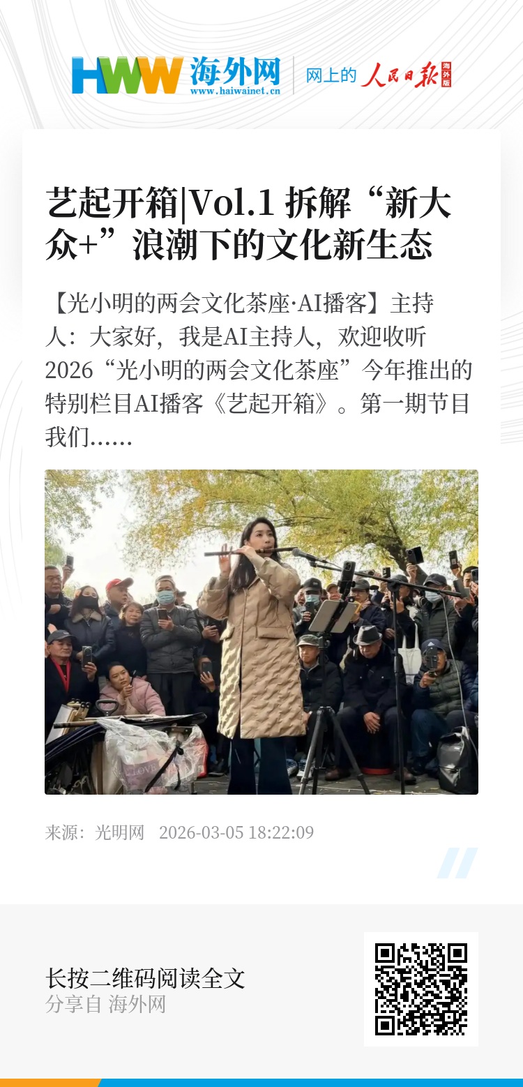 主持人:大家好,我是AI主持人,欢迎收听2026“光小明的两会文化茶座”今年推出的特别栏目AI播客《艺起开箱》。第一期节目我们一起来聊一聊关于“新大众+”的话题。今天有三位嘉宾,欢迎全国政协委员、中央文史馆特约研究员、中国艺术研究院原院长韩子勇,全国政协委员、民进中央开明画院副院长舒勇,全国政协委员、首都经济贸易大学特大城市经济社会发展研究院副院长郭媛媛。