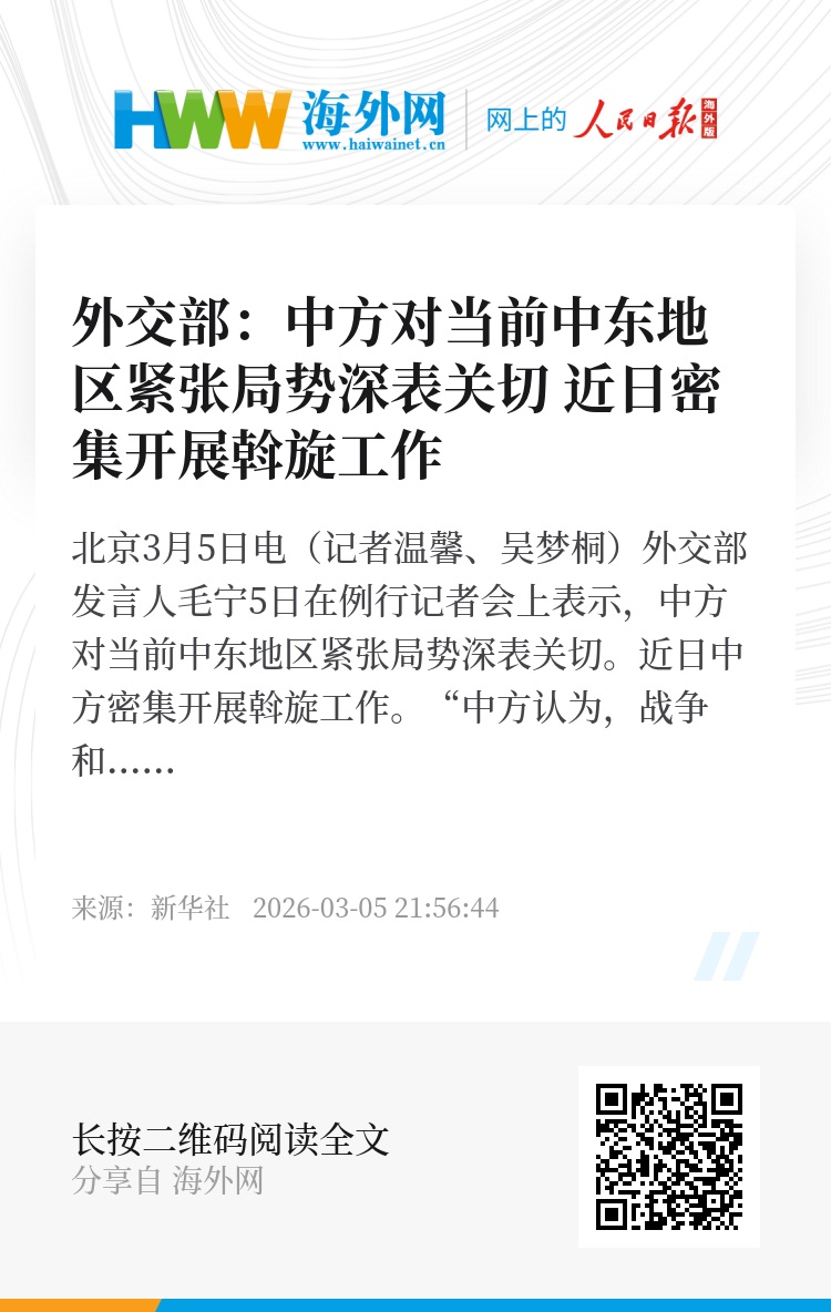 新华社北京3月5日电(记者温馨、吴梦桐)外交部发言人毛宁5日在例行记者会上表示,中方对当前中东地区紧张局势深表关切。近日中方密集开展斡旋工作。