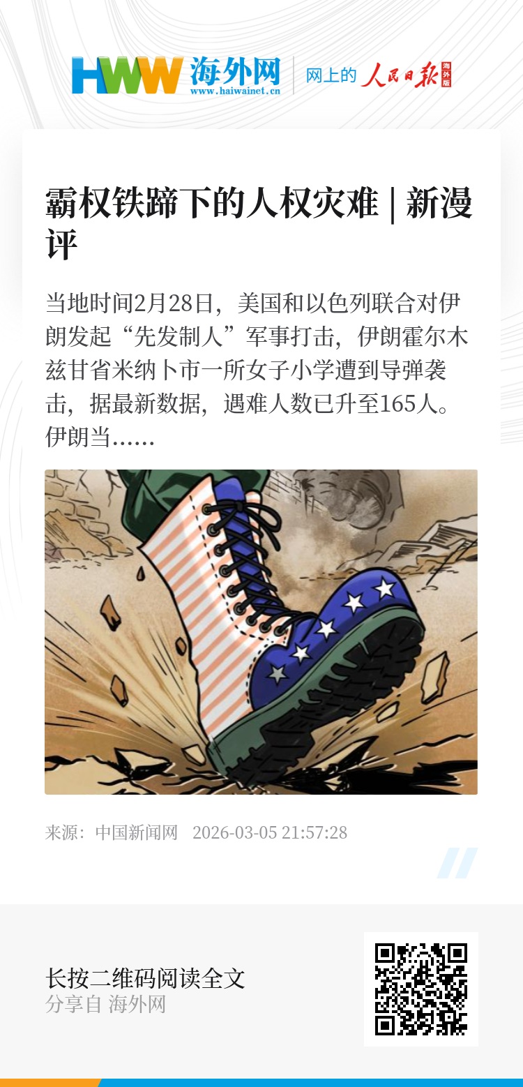 当地时间2月28日,美国和以色列联合对伊朗发起“先发制人”军事打击,伊朗霍尔木兹甘省米纳卜市一所女子小学遭到导弹袭击,据最新数据,遇难人数已升至165人。伊朗当地官员说,死者几乎全是小女孩。当学校沦为残垣断壁,当孩子被掩埋在废墟之下,战火给人类社会投下沉重阴影。