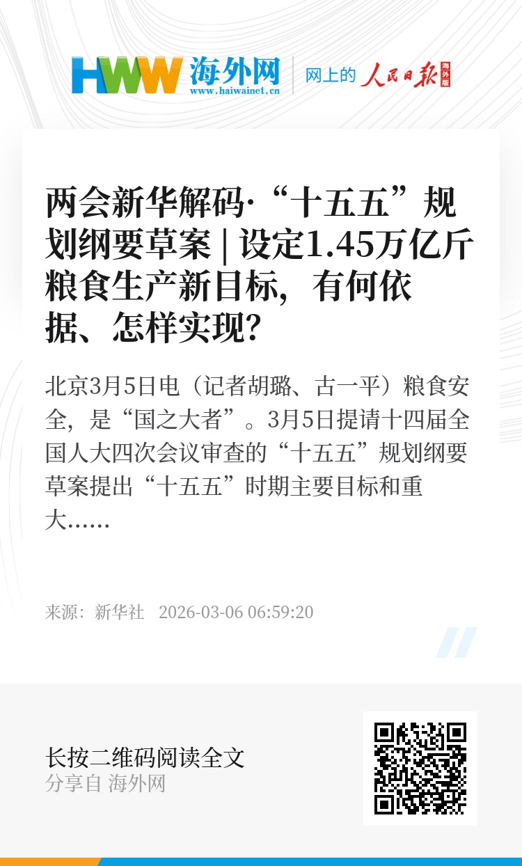 新华社北京3月5日电(记者胡璐、古一平)粮食安全,是“国之大者”。3月5日提请十四届全国人大四次会议审查的“十五五”规划纲要草案提出“十五五”时期主要目标和重大任务,明确粮食综合生产能力达到1.45万亿斤左右。