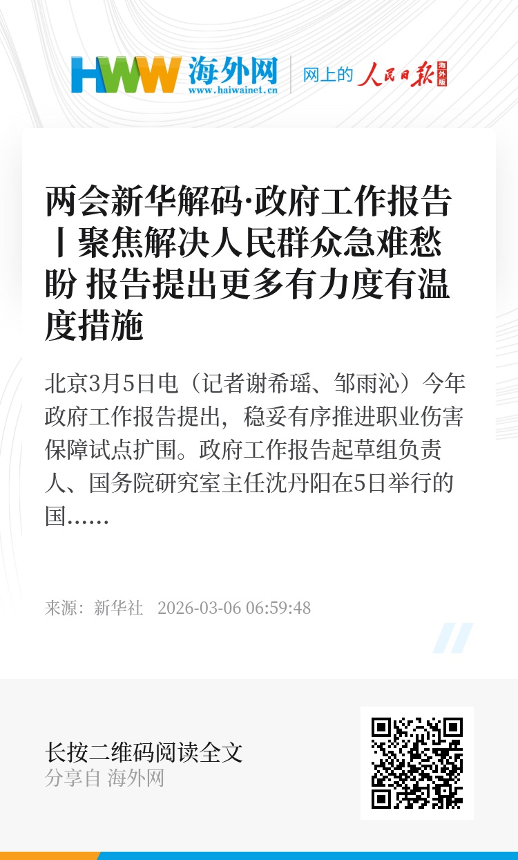新华社北京3月5日电(记者谢希瑶、邹雨沁)今年政府工作报告提出,稳妥有序推进职业伤害保障试点扩围。政府工作报告起草组负责人、国务院研究室主任沈丹阳在5日举行的国新办吹风会上对此表示,今年将实现全国31个省份和新疆生产建设兵团全覆盖,同时把出行、即时配送和同城货运这3个行业的平台企业总体纳入到试点范围,这将使更多外卖小哥、网约车司机等劳动者的劳动安全得到保障。
