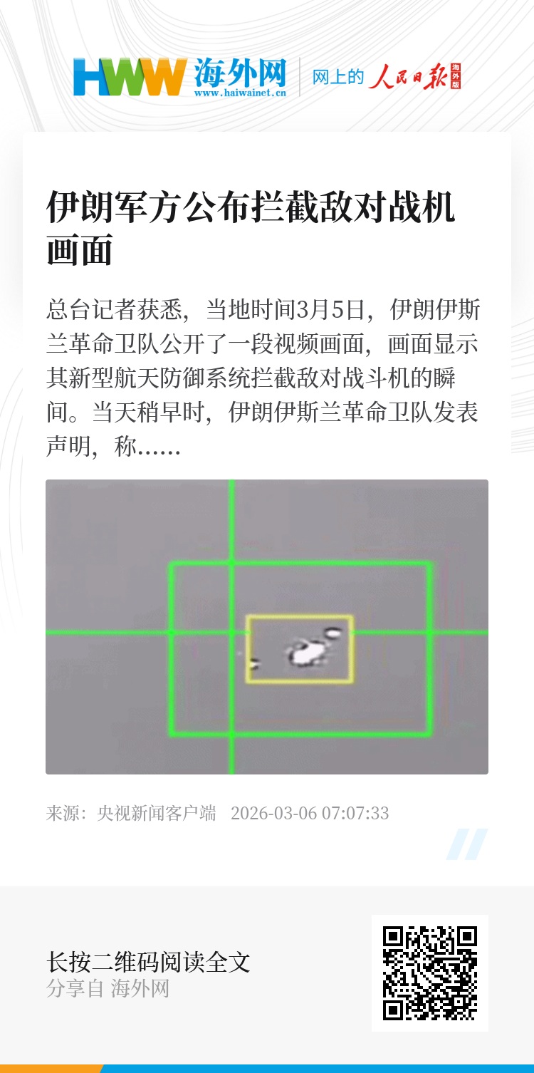 总台记者获悉,当地时间3月5日,伊朗伊斯兰革命卫队公开了一段视频画面,画面显示其新型航天防御系统拦截敌对战斗机的瞬间。