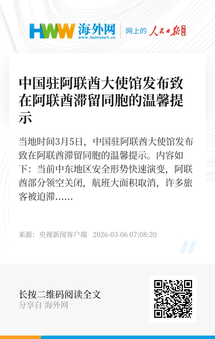 当地时间3月5日,中国驻阿联酋大使馆发布致在阿联酋滞留同胞的温馨提示。内容如下: