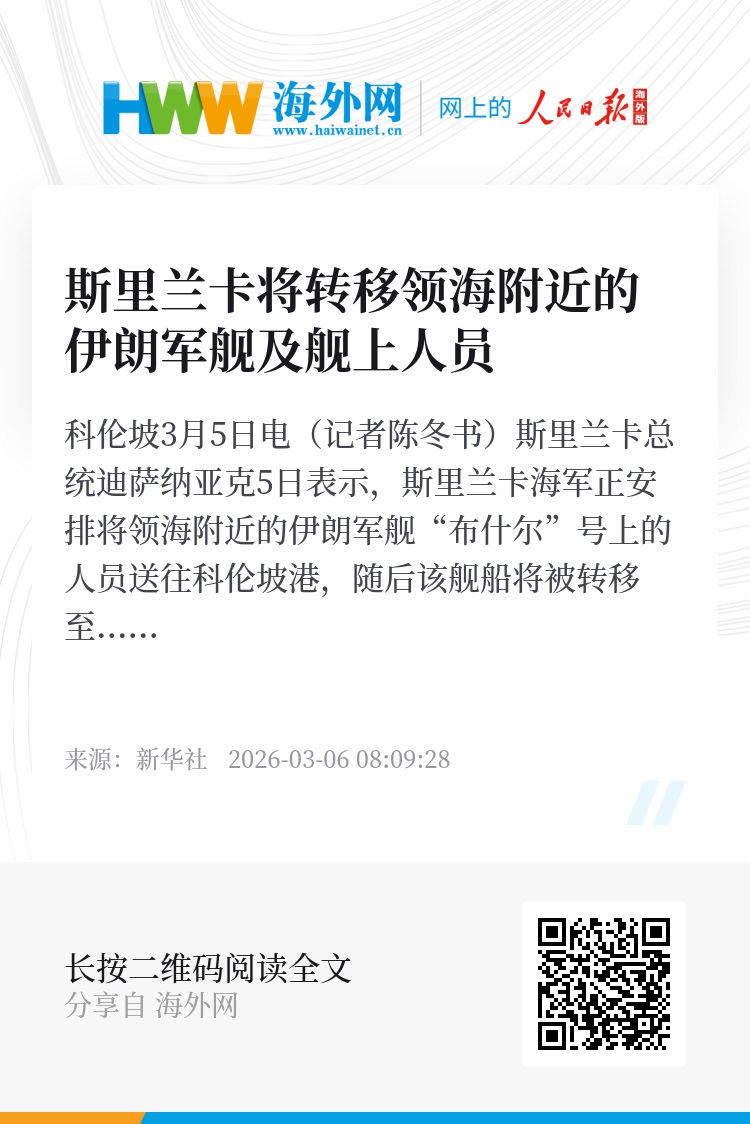 新华社科伦坡3月5日电(记者陈冬书)斯里兰卡总统迪萨纳亚克5日表示,斯里兰卡海军正安排将领海附近的伊朗军舰“布什尔”号上的人员送往科伦坡港,随后该舰船将被转移至斯东部亭可马里港。