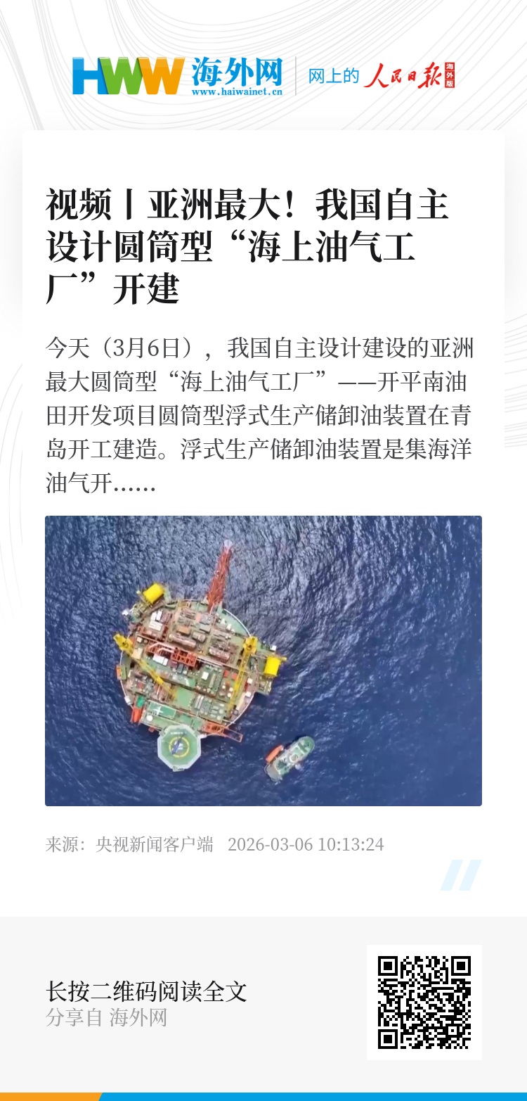 今天(3月6日),我国自主设计建设的亚洲最大圆筒型“海上油气工厂”——开平南油田开发项目圆筒型浮式生产储卸油装置在青岛开工建造。