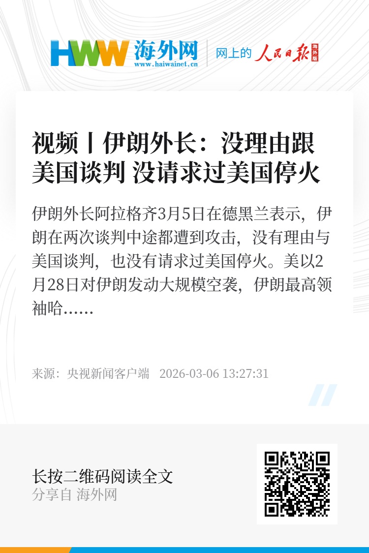 伊朗外长阿拉格齐3月5日在德黑兰表示,伊朗在两次谈判中途都遭到攻击,没有理由与美国谈判,也没有请求过美国停火。