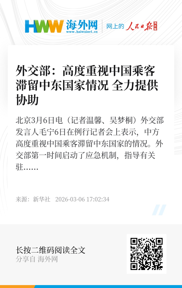 新华社北京3月6日电(记者温馨、吴梦桐)外交部发言人毛宁6日在例行记者会上表示,中方高度重视中国乘客滞留中东国家的情况。外交部第一时间启动了应急机制,指导有关驻外使领馆加强做外方工作,并全力为滞留同胞提供协助;同民航局等国内主管部门紧急会商,推动航空公司在确保安全的情况下尽快复飞航班。在各方共同努力下,相关工作取得积极进展。