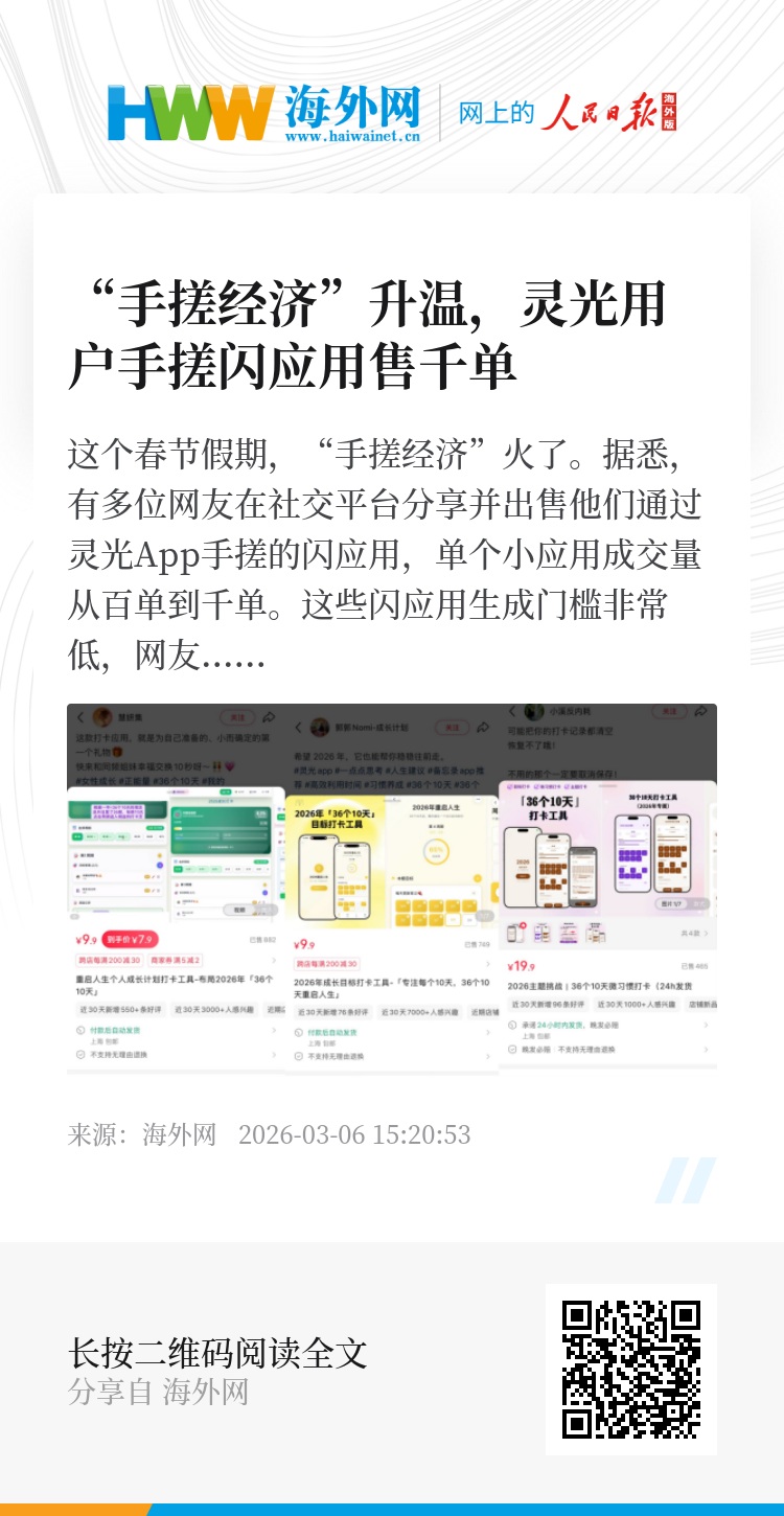 据悉,有多位网友在社交平台分享并出售他们通过灵光App手搓的闪应用,单个小应用成交量从百单到千单。这些闪应用生成门槛非常低,网友通过自然语言和灵光App对话,0成本创作,不会写代码也能搓出一个可交互的小应用。因其制作便捷,不受赛道限制,被当下年轻人发展成了一门“生意”。譬如,有用户手搓了主题为“36个10天”的个人成长目标打卡小工具用来督促自己成长,随后将其在个人店铺上架,不仅累计获得了近千笔订单,还得到了大量好评,购买者评价“操作界面简单、没有乱七八糟广告”。据不完全统计,在某社交平台,用灵光手搓出来的个人成长主题的小应用已售出数千单。