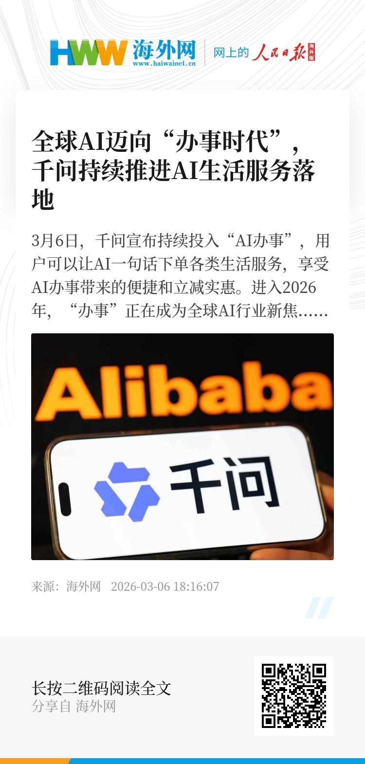 进入2026年,“办事”正在成为全球AI行业新焦点。谷歌、OpenAI相继重点投入“AI办事”。而在中国,AI已开始进入真实消费场景。今年春节期间,阿里千问完成了2亿笔真实订单,AI办事开始走进日常生活。