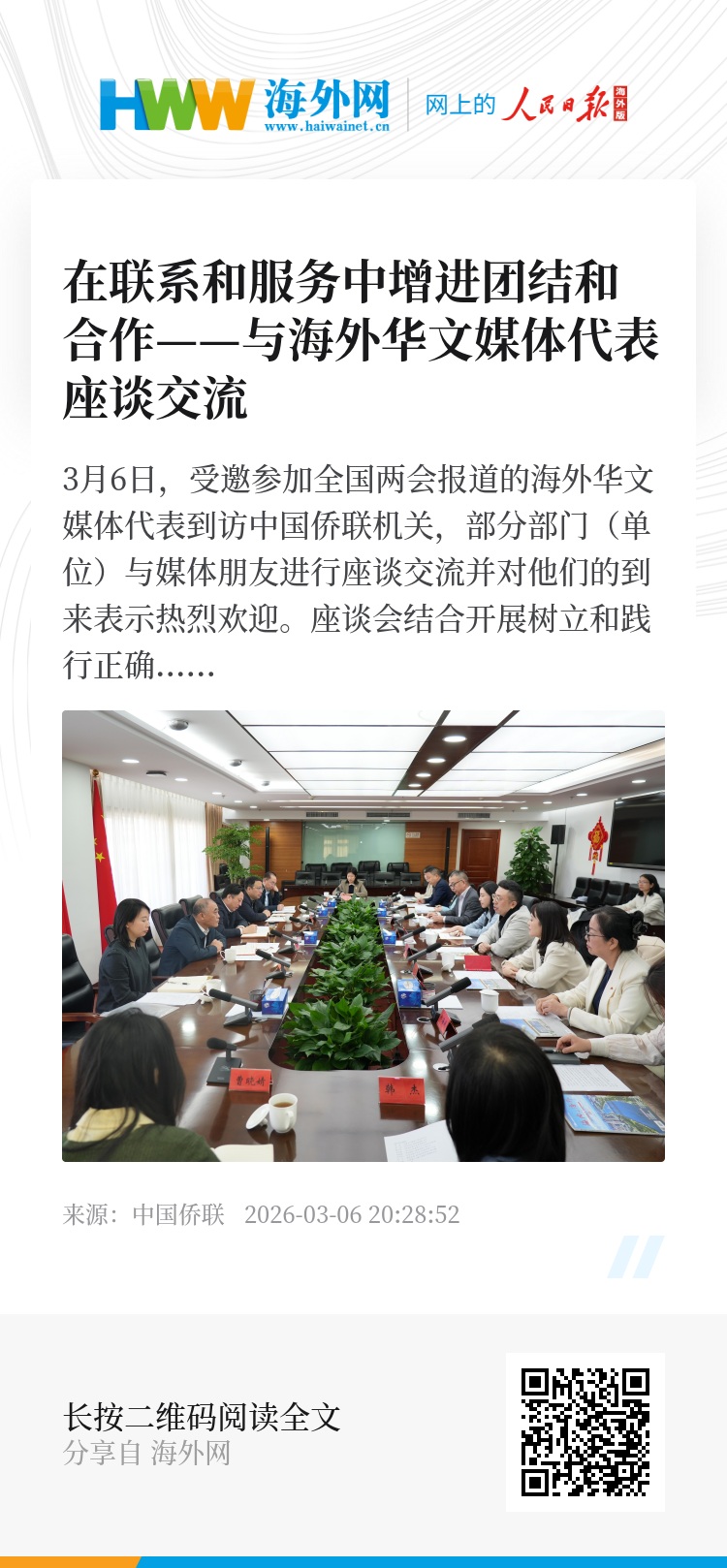 中国侨联信息传播部、文化交流部、《海内与海外》杂志社、《华侨华人历史研究》杂志负责同志以及人民日报海外网有关部门负责同志参加。