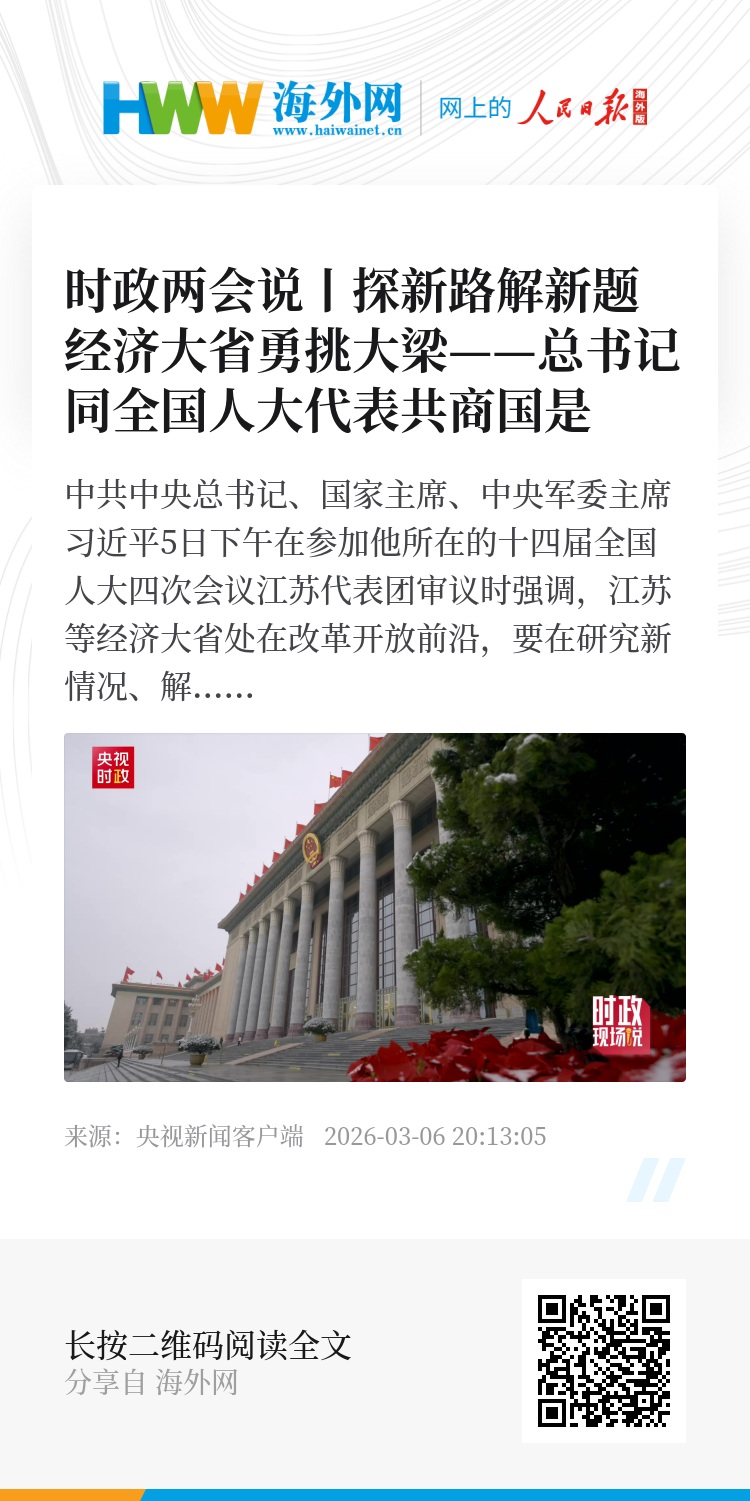 中共中央总书记、国家主席、中央军委主席习近平5日下午在参加他所在的十四届全国人大四次会议江苏代表团审议时强调,江苏等经济大省处在改革开放前沿,要在研究新情况、解决新问题上下功夫、出经验。