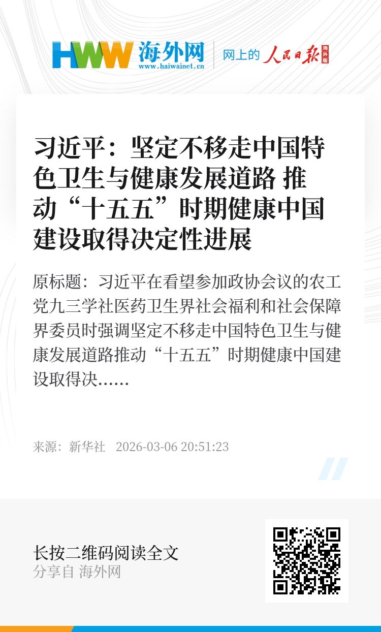 新华社北京3月6日电 中共中央总书记、国家主席、中央军委主席习近平6日下午看望了参加全国政协十四届四次会议的农工党、九三学社、医药卫生界、社会福利和社会保障界委员,并参加联组会,听取意见和建议。他强调,到2035年建成健康中国是中共中央作出的一项战略决策,“十五五”是实现这一目标的关键时期,必须统筹谋划、加紧推进,力求取得决定性进展。