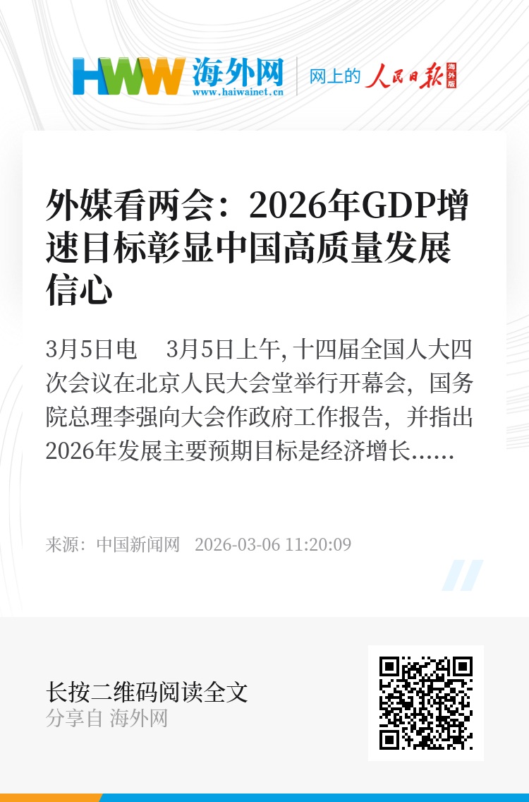 中新网3月5日电 3月5日上午,十四届全国人大四次会议在北京人民大会堂举行开幕会,国务院总理李强向大会作政府工作报告,并指出2026年发展主要预期目标是经济增长4.5%-5%,在实际工作中努力争取更好结果。路透社、美联社、英国《金融时报》等多家国际主流媒体第一时间聚焦中国两会,中国2026年经济增长目标受到广泛关注,成为各方讨论焦点。