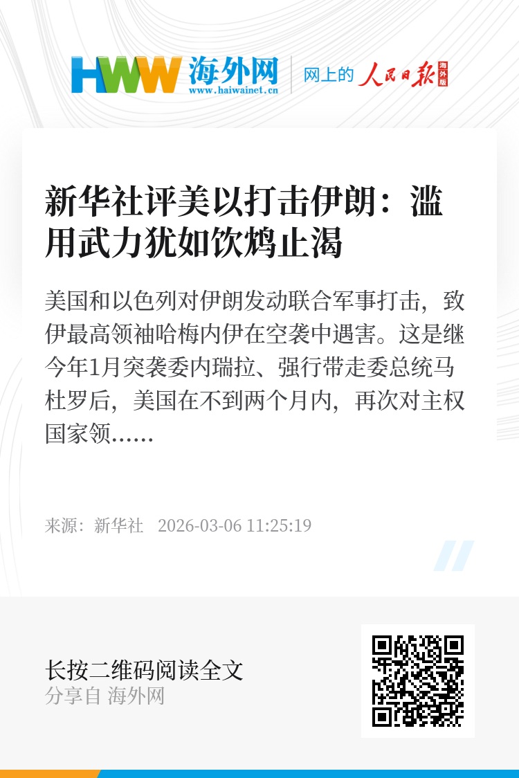 美国和以色列对伊朗发动联合军事打击,致伊最高领袖哈梅内伊在空袭中遇害。这是继今年1月突袭委内瑞拉、强行带走委总统马杜罗后,美国在不到两个月内,再次对主权国家领导人采取极端军事行动。从拉美到中东,从强行控制到公然击杀,国际秩序的边界被不断突破,人类文明的底线被公然践踏,其破坏性值得国际社会高度警惕。