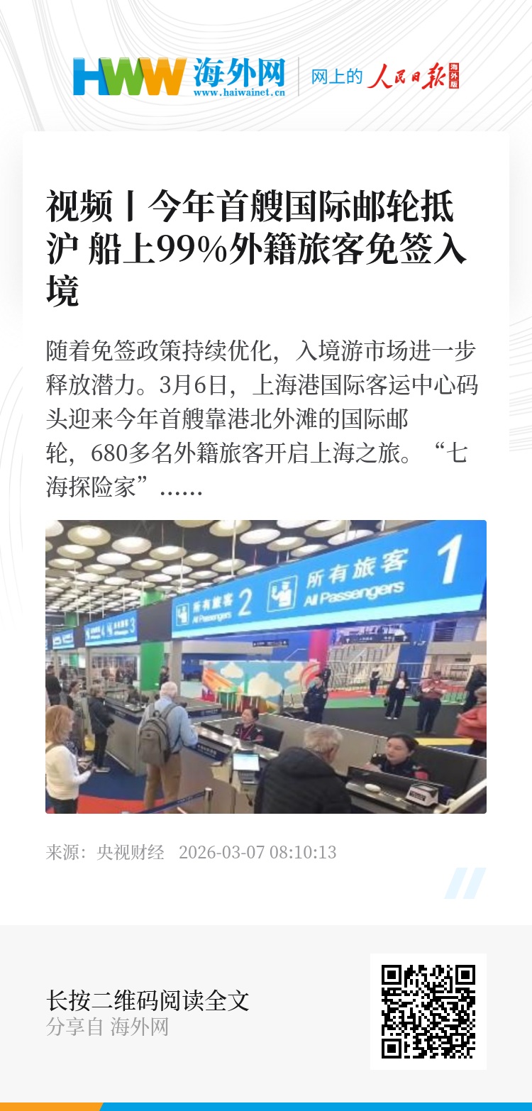 随着免签政策持续优化,入境游市场进一步释放潜力。3月6日,上海港国际客运中心码头迎来今年首艘靠港北外滩的国际邮轮,680多名外籍旅客开启上海之旅。