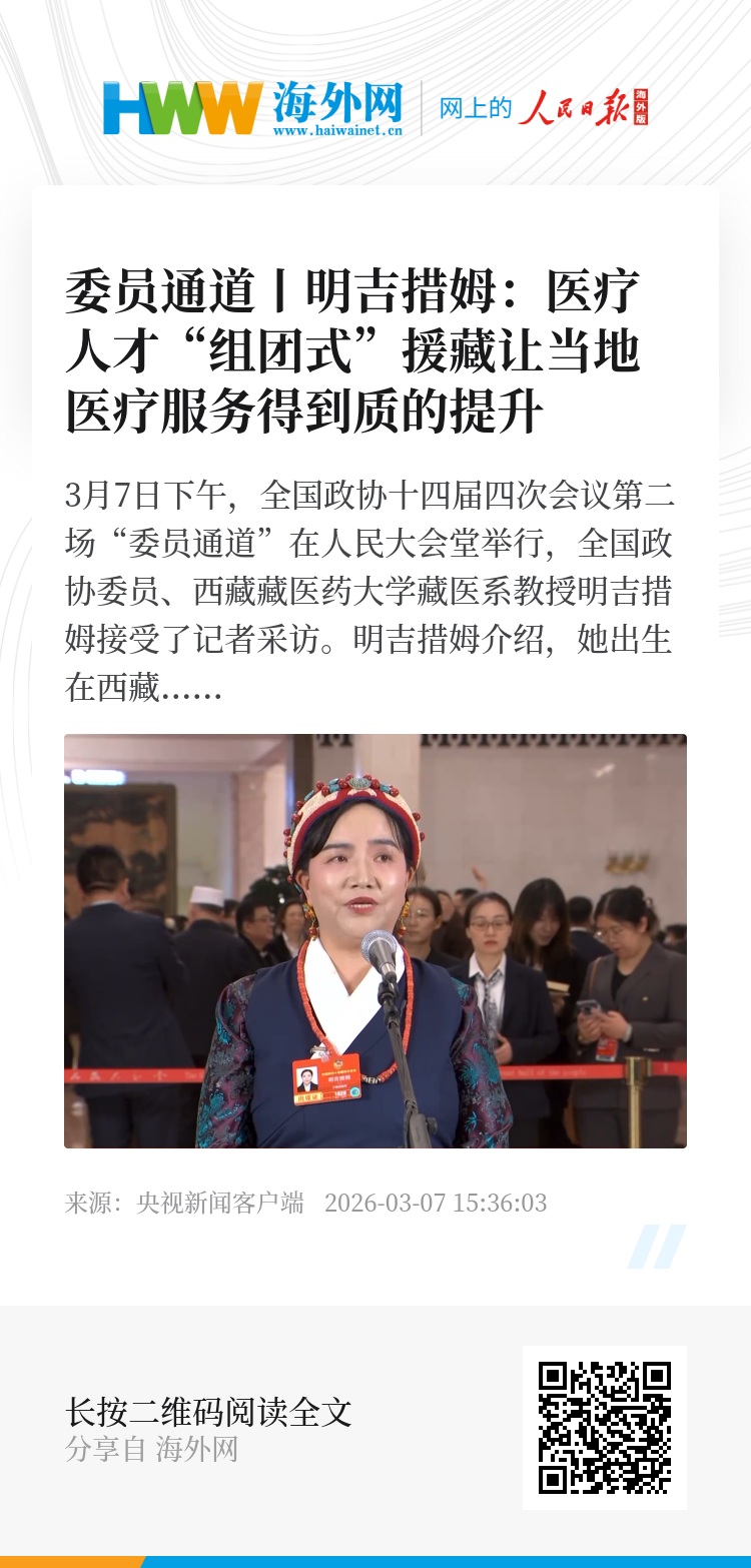 3月7日下午,全国政协十四届四次会议第二场“委员通道”在人民大会堂举行,全国政协委员、西藏藏医药大学藏医系教授明吉措姆接受了记者采访。