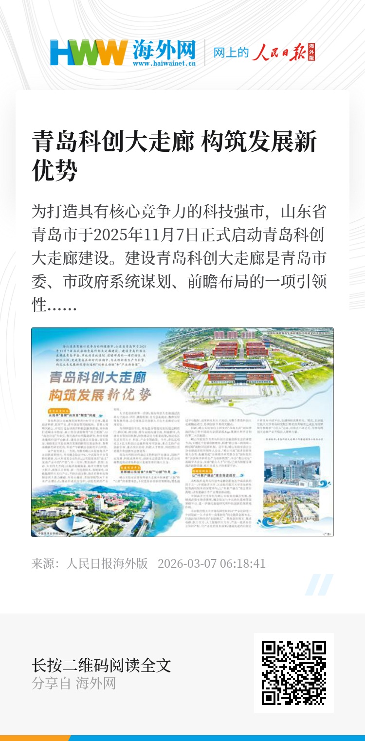为打造具有核心竞争力的科技强市,山东省青岛市于2025年11月7日正式启动青岛科创大走廊建设。建设青岛科创大走廊是青岛市委、市政府系统谋划、前瞻布局的一项引领性、关键性工程,更是青岛在新时代浪潮中,为点燃新质生产力引擎、构筑未来发展新优势打造的“创新主动脉”和“产业新脊梁”。