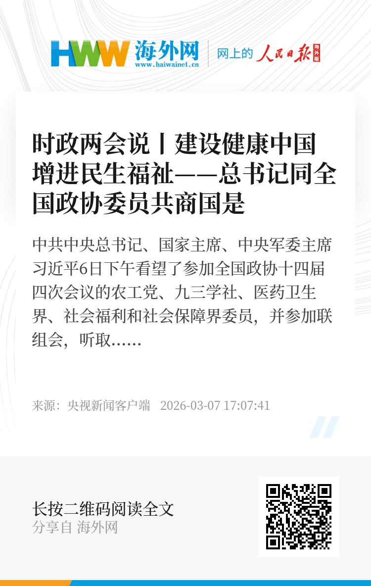中共中央总书记、国家主席、中央军委主席习近平6日下午看望了参加全国政协十四届四次会议的农工党、九三学社、医药卫生界、社会福利和社会保障界委员,并参加联组会,听取意见和建议。