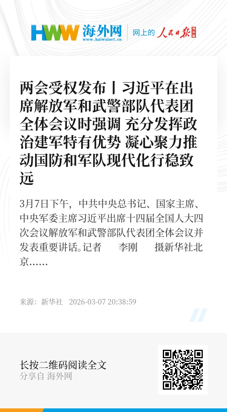 新华社北京3月7日电(记者梅常伟)中共中央总书记、国家主席、中央军委主席习近平7日下午在出席十四届全国人大四次会议解放军和武警部队代表团全体会议时强调,“十五五”时期要如期实现建军一百年奋斗目标、高质量推进国防和军队现代化,必须坚持好、运用好、发展好政治建军这个重要法宝,毫不动摇坚持和加强党对军队绝对领导,充分发挥政治建军特有优势,凝心聚力推动国防和军队现代化行稳致远。