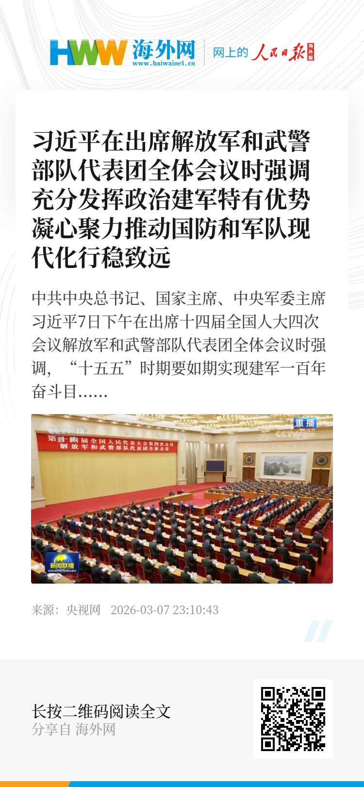 中共中央总书记、国家主席、中央军委主席习近平7日下午在出席十四届全国人大四次会议解放军和武警部队代表团全体会议时强调,“十五五”时期要如期实现建军一百年奋斗目标、高质量推进国防和军队现代化,必须坚持好、运用好、发展好政治建军这个重要法宝,毫不动摇坚持和加强党对军队绝对领导,充分发挥政治建军特有优势,凝心聚力推动国防和军队现代化行稳致远。
